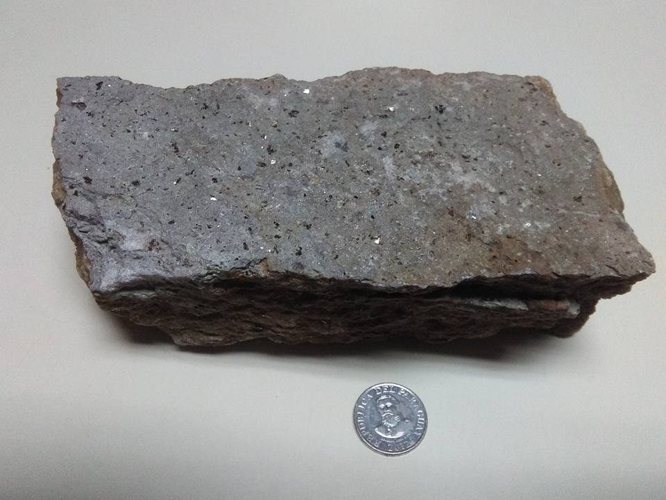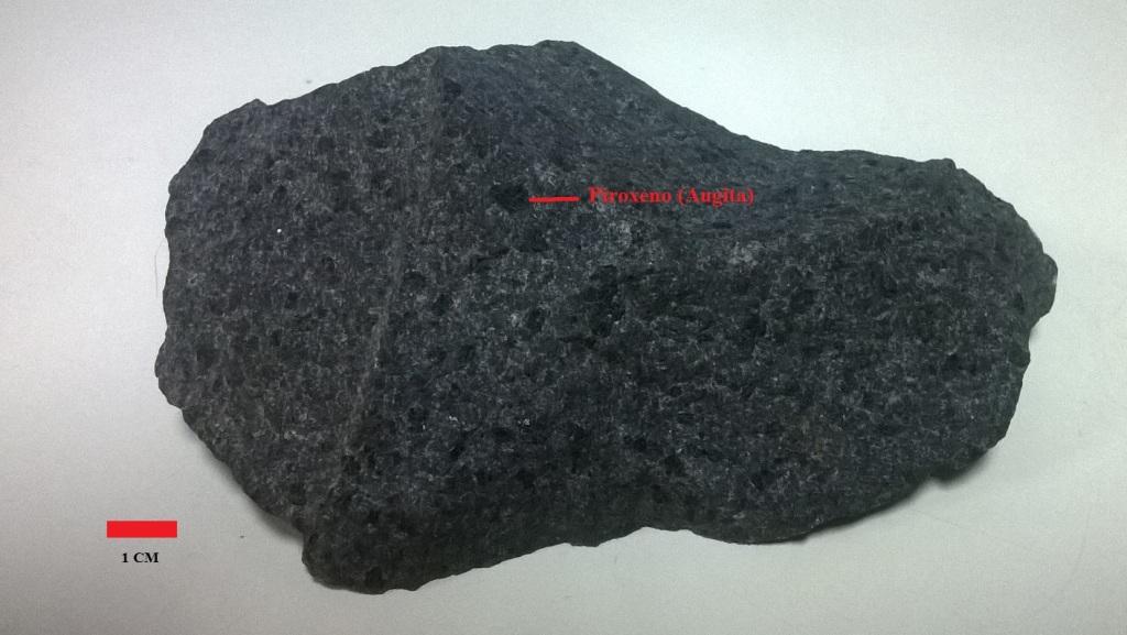 Roca ígnea extrusiva que se compone de los minerales piroxeno, feldespatoides(leucita), feldespato plagioclasa. Roca muy magnética, debido a la presencia de magnetita y minerales de ilmenita. Colonia Santa Isabel, zona de Sapucai.