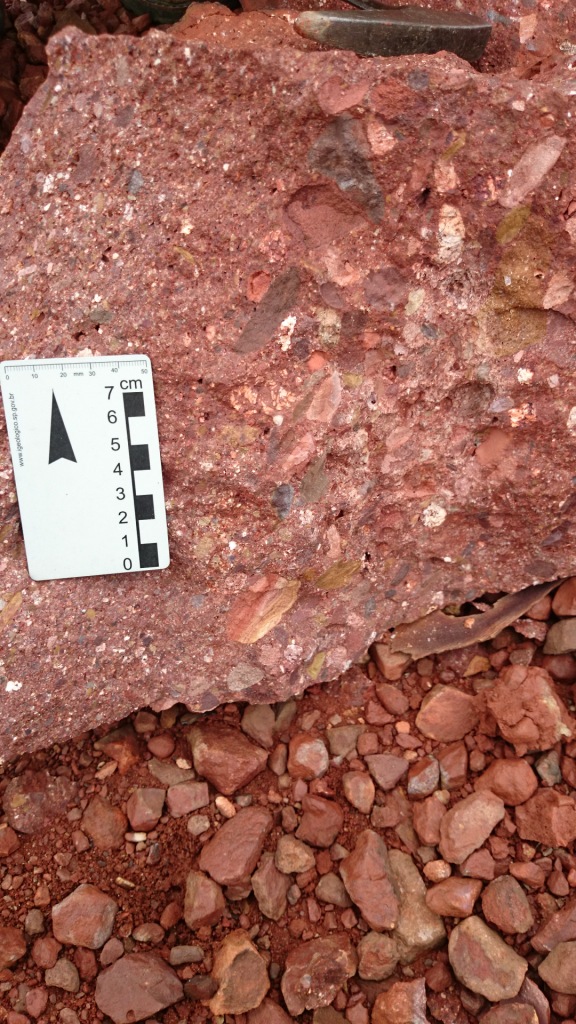 Paraconglomerado del tipo brecha tectónica (sedimentos cataclásticos) de mala selección granulométrica y mineralógica, cuya fracción clástica (muy angulosos) es notablemente menor en cantidad a la matriz (con abundante hematita) y con evidencia de meteorización química. Existen afloramientos escasos y aislados en el margen SW del rift de Asunción, donde se destaca el cerro Perõ, en la localidad de Paraguarí. Uso: Materiales de construcción. 25.614°S ; -57.148°O |